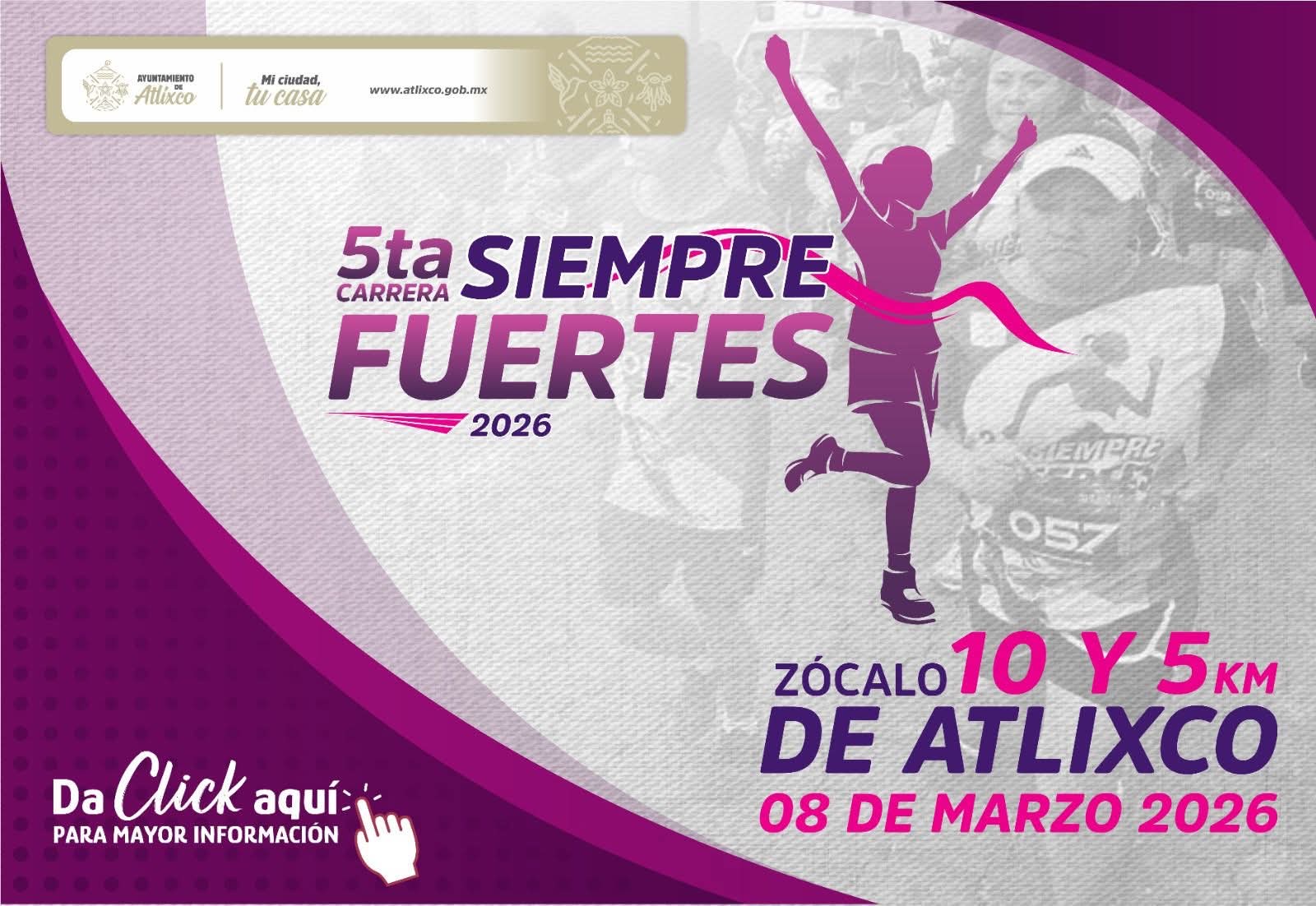 Entre los eventos principales destaca la carrera “Siempre Fuertes” la cual se llevará a cabo a las 08:00 horas en el Zócalo de Atlixco, con distancias de 5 y 10 kilómetros.