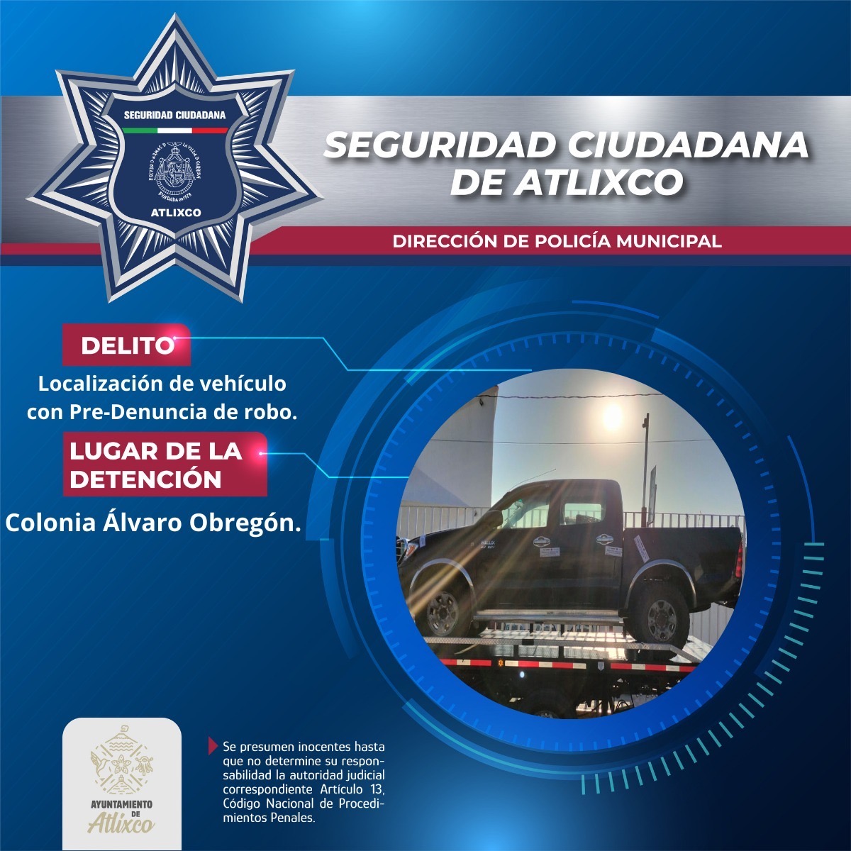 Elementos de la Policía de Atlixco localizaron una camioneta con reporte de robo vigente durante un recorrido de seguridad y vigilancia en la colonia Revolución.