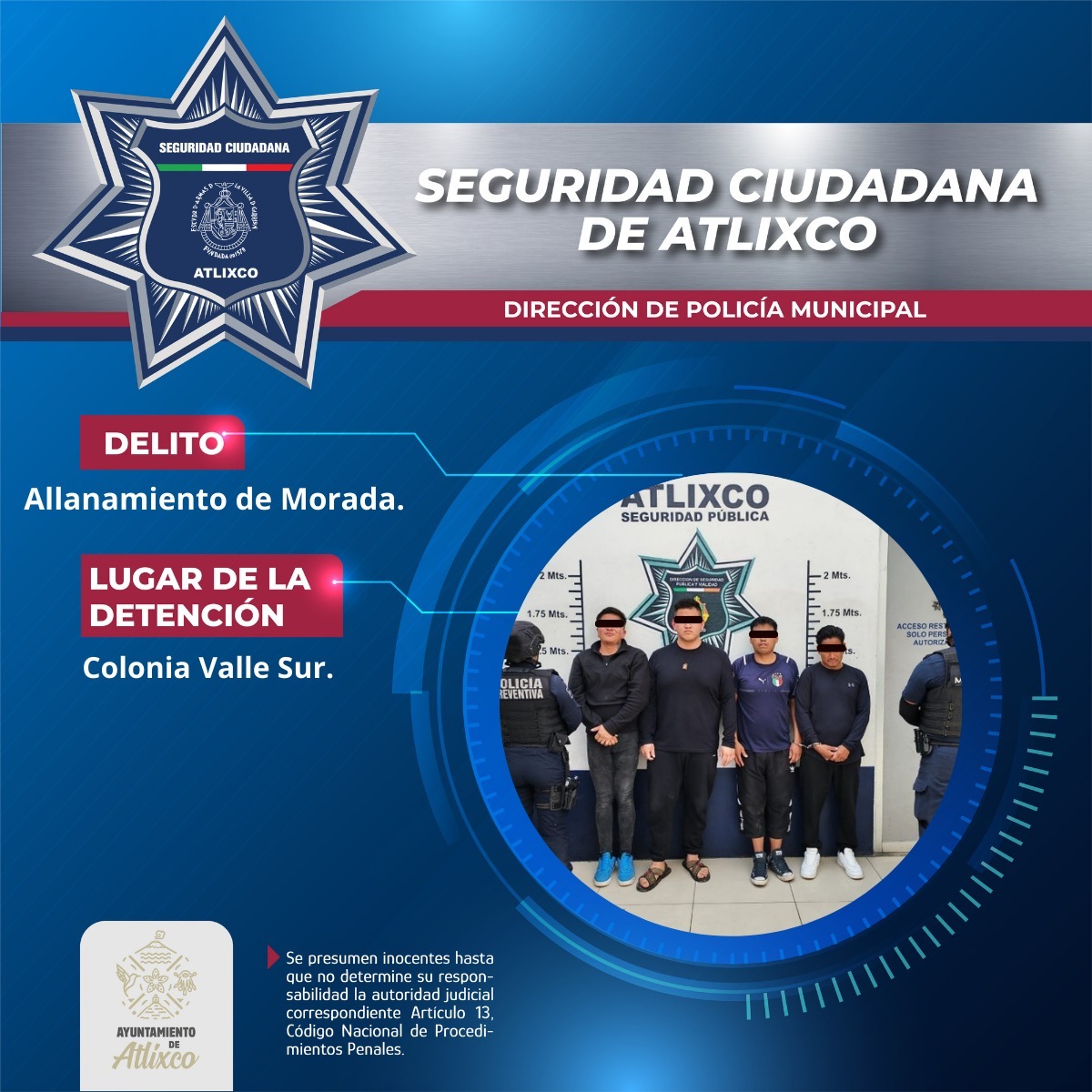 Elementos de la Secretaría de Seguridad Ciudadana de Atlixco detuvieron a cuatro hombres por su presunta participación en el delito de allanamiento de morada en la colonia Valle Sur.