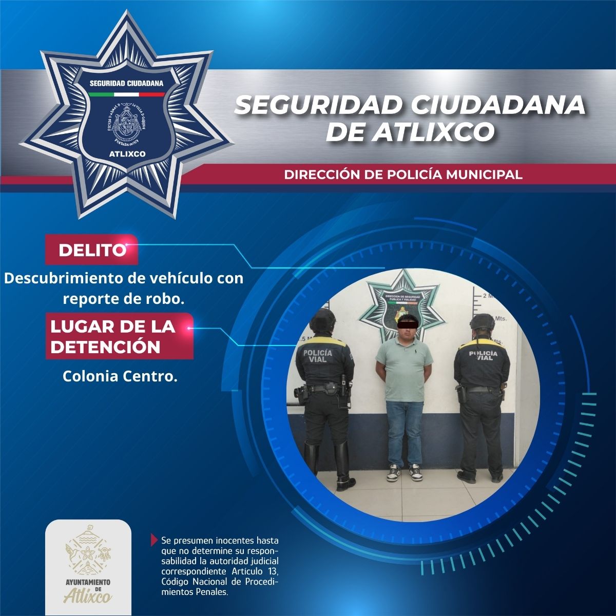 La Secretaría de Seguridad Ciudadana de Atlixco, a través de la Dirección de Tránsito y Vialidad, aseguró una camioneta con reporte de robo y detuvo a un hombre por el probable delito de detentación de vehículo robado.